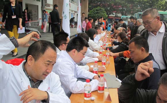 當天上午,在東莞石龍鎮金沙灣購物廣場和石龍匯聯步行街廣場,我校博士后聯誼會會同東莞石龍鎮石龍博愛醫院的醫生們,在石龍鎮人群密集的廣場舉辦義診活動,吸引了不少市民前來問診。博士后們將各自的專業知識和臨床經驗用到實處:心內科專業的博士后手握聽診器為市民們測血壓、測脈搏,而來自婦科的博士后則耐心解答前來咨詢的準媽媽們的疑惑。