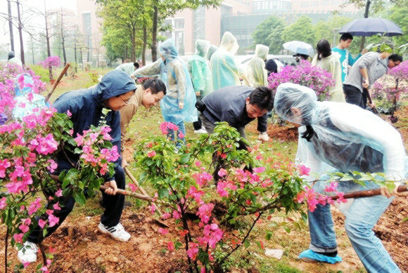 3月30日上午,資訊管理學院70余位師生,在學院大樓兩側的草坪上種下了100棵簕杜鵑和10棵四季桂。