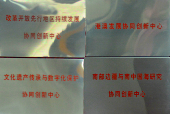 為積極貫徹黨的十八大精神和2011年胡錦濤同志在清華大學百年校慶上的講話精神,落實教育部、財政部《關于實施高等學校創新能力提升計劃的意見》,提升高等學校文化傳承創新能力,加快創建世界一流大學步伐,我校與北京大學、復旦大學等單位共同組建“改革開放先行地區持續發展協同創新中心”,與北京大學、國務院港澳事務辦公室港澳研究所、澳門大學等單位共同組建“港澳發展協同創新中心”,與廈門大學、哈爾濱工業大學、華中師范大學等共同組建“文化遺產傳承與數字化保護協同創新中心”,與云南大學、廣西民族大學、中國科學院南海海洋研究所等單位共同組建“南部邊疆與南中國海研究協同創新中心”。