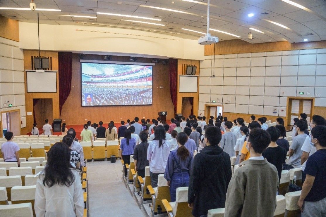 16日上午,廣州校區南校園小禮堂,在校校領導和校長助理,機關部處負責人,師生代表共同聆聽了習近平總書記的大會報告。會場內,大家通過屏幕深切感受到了人民大會堂內莊重熱烈的現場氛圍。
