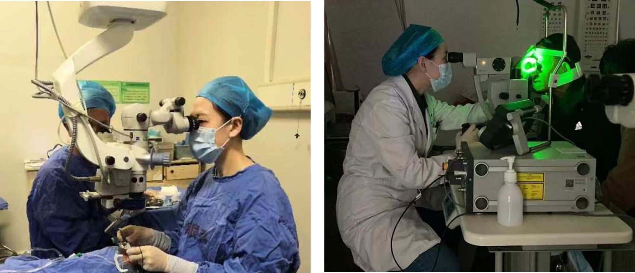 左圖:余曦靈開展玻璃體視網(wǎng)膜手術(shù) 右圖:余曦靈開展視網(wǎng)膜激光光凝手術(shù)