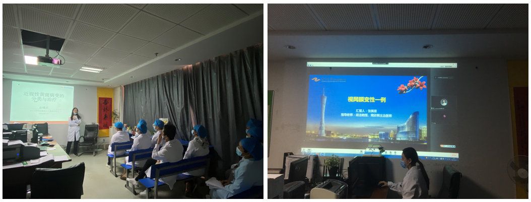 左圖:余曦靈開展眼底病專題講課 右圖:視頻會議連線中山眼科中心眼底外科參與病例討論