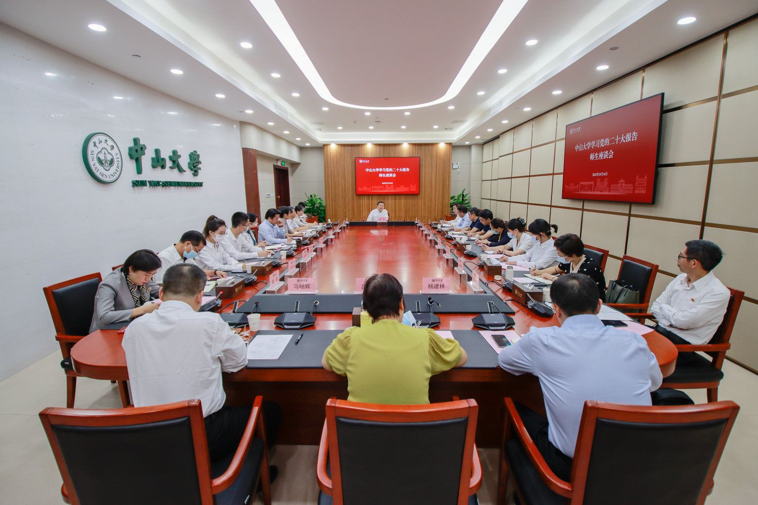 中大新聞網廣州10月18日電(記者余婷)10月16日,中國共產黨第二十次全國代表大會在北京隆重開幕。習近平總書記代表十九屆中央委員會向大會作報告。10月16日下午,中山大學在廣州校區南校園中山樓召開學習交流座談會。中山大學黨委副書記、校長、中國科學院院士高松,中山大學黨委副書記余敏斌,部分職能部門負責人,教師、學生代表參加座談,與會人員圍繞黨的二十大報告分享學習心得和體會。