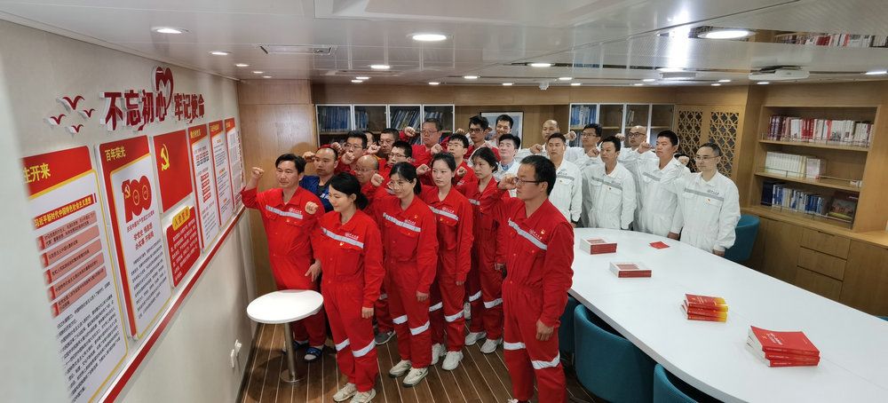 科考設(shè)備海試驗(yàn)收航次第一航段臨時(shí)黨支部全體黨員在科考船上重溫入黨誓詞