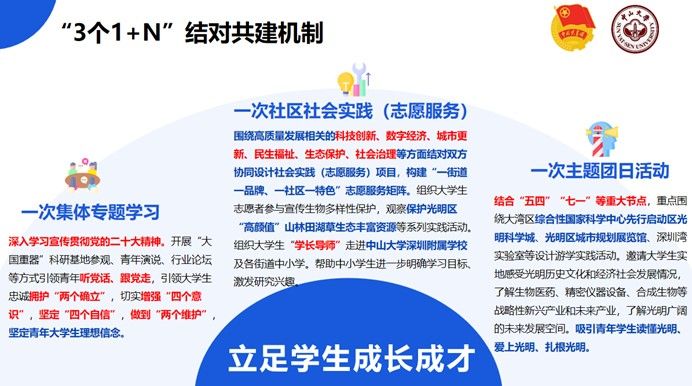 為使結對共建有方向、有抓手,此次中山大學團委與屬地團組織結對共建以團支部為基本單元,建立“3個1+N”共建機制,具體為一次集體專題學習、一項社區社會實踐特色項目和一次主題團日活動,N為結合院系、街道特點自選開展的共建行動。以團支部為單位組織一次專題學習,為青年注入思想力量;開展一項社區社會實踐特色項目,打造志愿服務矩陣,以“行”促“思”,在實踐中增長才干;結合重大節點開展一次主題團日活動,融入地域特色及專業特色,激發團支部活力。屬地團組織還積極統籌屬地黨政機關、企事業單位實習實踐崗位,為我校青年學子就近就便開展實踐提供平臺,共同助力地方高質量發展。