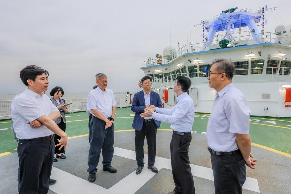 會后,陳振林一行前往我國最大的海洋綜合科考實習(xí)船“中山大學(xué)”號現(xiàn)場調(diào)研,聽取了船舶管理和航次科考情況的介紹,實地走訪了駕駛臺、甲板、實驗室、海上圖書館、船員生活區(qū)等,查看了發(fā)動機(jī)、主推進(jìn)系統(tǒng)、絞車系統(tǒng)等機(jī)艙設(shè)備,全面了解了“中山大學(xué)”號的船舶設(shè)計亮點和綜合科考性能。