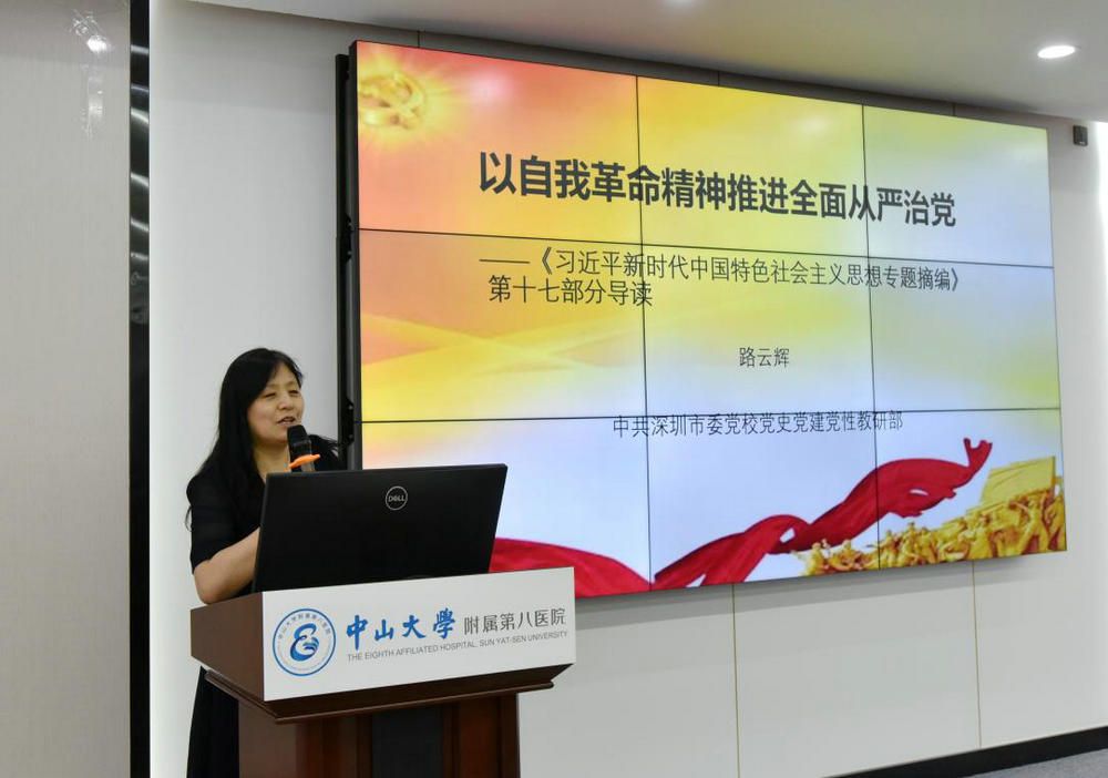 中大新聞網訊(通訊員佟艷婷)5月10日,附屬第八醫院黨委舉行學習貫徹習近平新時代中國特色社會主義思想主題教育讀書班專題輔導報告會,邀請深圳市委黨校路云輝教授作題為“以自我革命精神推進全面從嚴治黨——《習近平新時代中國特色社會主義思想專題摘編》第十七部分導讀”的專題輔導報告。中山大學主題教育巡回指導組第八組副組長羅干坤列席會議并作指導講話。醫院領導班子成員、各黨支部書記50余人參加學習。