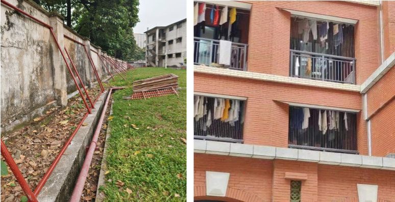 左圖:北校園圍墻應急加固 右圖:宿舍安裝隱形防護網