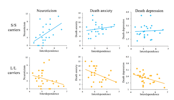 圖1. 5-HTTLPR兩種基因型個體中互依文化價值取向與死亡相關/無關焦慮的聯系
