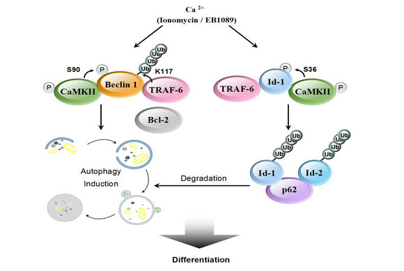 神經(jīng)母細(xì)胞瘤是兒童最常見的顱外腫瘤,約占兒童腫瘤的6-10%,占兒童腫瘤死亡的15%。神經(jīng)母細(xì)胞瘤具有高度未分化的特性,對于高危型患兒的治療進(jìn)展緩慢,需要尋找更加有效的治療策略。自噬是細(xì)胞在物質(zhì)能量缺乏或外環(huán)境壓力下,生物大分子或細(xì)胞器經(jīng)雙層膜結(jié)構(gòu)囊泡包裹并被大量降解的過程。自噬與惡性腫瘤發(fā)生發(fā)展的關(guān)系是近年來學(xué)界所關(guān)注的熱點(diǎn)問題。自噬在細(xì)胞分化中的作用鮮為報(bào)道,朱孝峰教授研究團(tuán)隊(duì)發(fā)現(xiàn)鈣調(diào)蛋白激酶CaMKII可以直接磷酸化Beclin 1的絲氨酸90位點(diǎn),并促進(jìn)后者發(fā)生K63型泛素化進(jìn)而激活自噬,同時(shí),CaMKII也可以磷酸化分化抑制蛋白Id1和Id2,磷酸化的Id蛋白進(jìn)而與泛素連接酶TRAF6結(jié)合,促進(jìn)Id蛋白的K63型泛素化,泛素化的Id1和Id2通過與自噬受體P62的結(jié)合被帶入到自噬體中降解。Id蛋白的降解促進(jìn)了神經(jīng)母細(xì)胞瘤細(xì)胞分化,從而達(dá)到抑制腫瘤的目的。