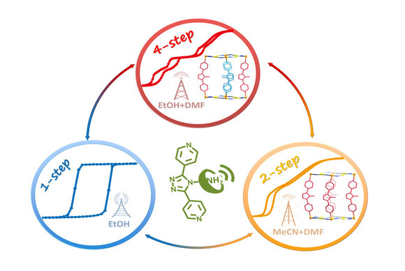 分子雙穩(wěn)態(tài)是指分子在一定的外界條件下可以存在兩種穩(wěn)定或介穩(wěn)的電子狀態(tài)。具有d4-d7電子構(gòu)型的過(guò)渡金屬離子在八面體場(chǎng)中受外界的某些擾動(dòng)時(shí),其電子構(gòu)型會(huì)發(fā)生重組,由高自旋態(tài)(high-spin, HS)變?yōu)榈妥孕龖B(tài)(low-spin, LS),這兩種狀態(tài)分別對(duì)應(yīng)著金屬軌道能級(jí)中電子的排布出現(xiàn)最大和最小未成對(duì)電子數(shù)目的情況,被稱(chēng)為自旋交叉(spin crossover,SCO)或者自旋轉(zhuǎn)換現(xiàn)象(spin transition,ST)。自旋交叉材料可在溫度、壓力和光照的微擾下實(shí)現(xiàn)高自旋(HS)和低自旋(LS)兩種狀態(tài)的可逆轉(zhuǎn)變,并伴隨著結(jié)構(gòu)、顏色、磁性和介電等性質(zhì)的巨大改變,因此在高密度信息存儲(chǔ)、顯色器件、開(kāi)關(guān)材料等方面具有潛在的應(yīng)用。鑒于自旋交叉性質(zhì)對(duì)客體分子極其敏感,客體分子的吸附和脫附可有效地改變主體的自旋交叉性質(zhì),因此客體調(diào)控的自旋交叉體系有望應(yīng)用于化學(xué)傳感器,在近十幾年來(lái)受到了廣泛的重視。近年來(lái)多步自旋交叉性質(zhì)因其具有多個(gè)穩(wěn)定的電子自旋態(tài)而成為研究熱點(diǎn),它有望實(shí)現(xiàn)超高密度信息存儲(chǔ)。