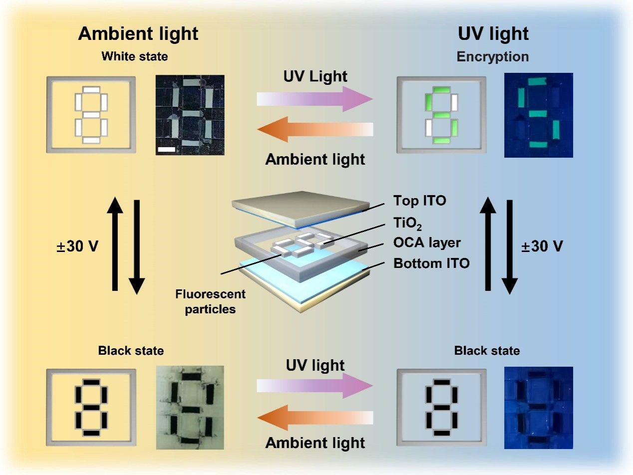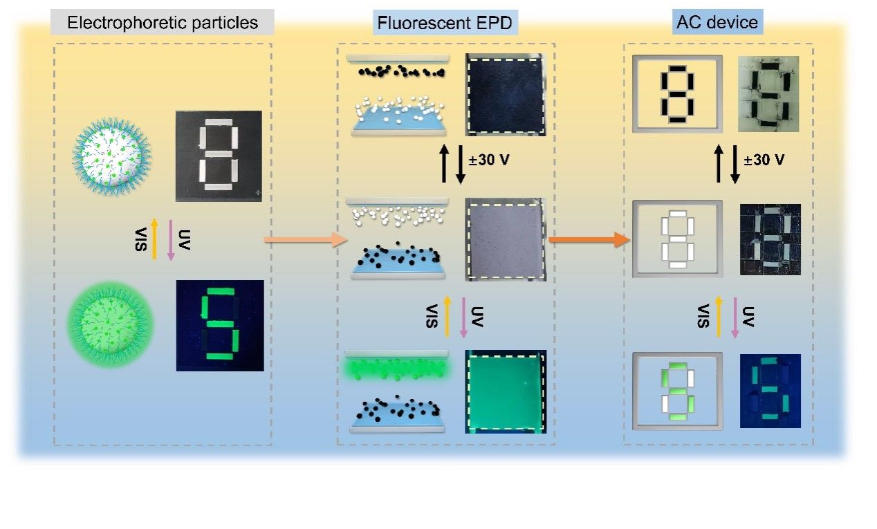 防偽技術在防止假冒產(chǎn)品和保護機密信息方面至關重要,廣泛應用于產(chǎn)品標簽、護照、機密文件等領域。光學防偽設備具有顯示性能好、使用便捷和響應速度快等優(yōu)點,但單一功能的防偽技術存在容易被復制且安全性不夠的問題。因此,需開發(fā)具備動態(tài)顯示功能的防偽設備。電泳顯示器件(EPD)因其低功耗、動態(tài)圖像切換和高環(huán)境對比度等優(yōu)勢,成為動態(tài)防偽技術的理想選擇。然而,目前商用EPD設備大多僅在可見光條件下工作,顯示性能依賴于光源強度,限制了其在黑暗環(huán)境和非可見光條件下的應用。熒光電泳顯示技術則能使EPD在紫外光下正常工作,拓展了傳統(tǒng)EPD在紫外光場景中的應用可能。同時,通過結合反射和發(fā)射的雙顯示模式,可以實現(xiàn)多模式的動態(tài)防偽應用。