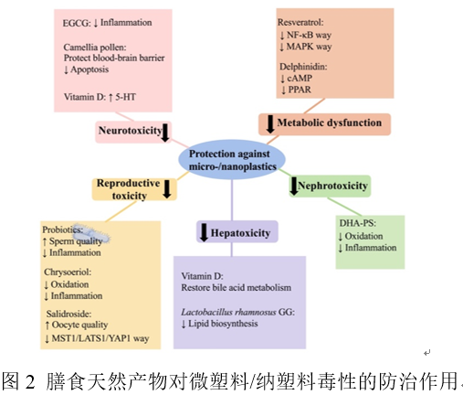 該文總結了人的微塑料暴露情況。微塑料/納塑料已在多種食品中檢測出(鹽、茶葉、海產品、牛奶、大米、水果、蔬菜、醬油),也在人體的多個器官被檢測出,例如肺、結腸、心臟、胎盤、骨髓、血液、母乳。闡述了微塑料對人類健康的潛在危害,它表現出了肝臟毒性、腎臟毒性、神經毒性、致癌性、生殖毒性、發育毒性等,并且還會誘發腸道紊亂、心血管疾病、肥胖、糖尿病等。另一方面,某些膳食天然產物,例如益生菌、褪黑素、白藜蘆醇、紅景天苷、表沒食子兒茶素沒食子酸酯、維生素D、多不飽和脂肪酸DHA-PS,能夠預防微塑料的健康危害。