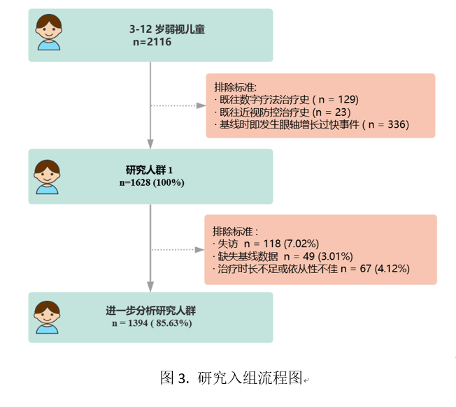 本研究基于中山大學中山眼科中心視覺康復與重建平臺真實世界數據,經嚴格篩選,共納入2019年1月-2024年1月在附屬眼科醫院就診的1394名3-12歲的弱視兒童(圖3)。其中,477人接受每天30分鐘的弱視數字療法治療。所有弱視兒童在基線和隨訪期間測量眼軸長度。采用Cox比例風險模型評估數字療法對眼軸增長過快事件的影響。