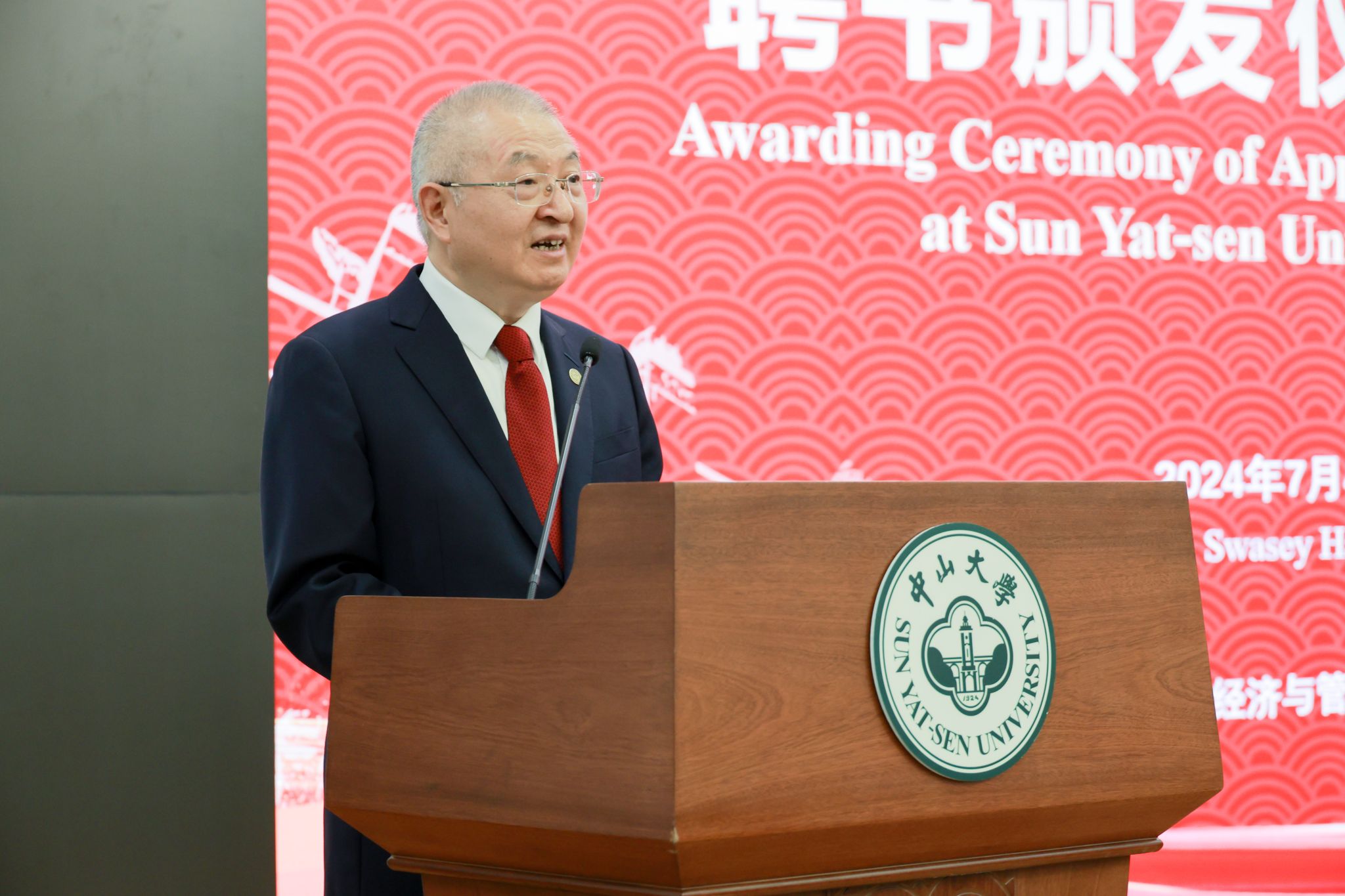 中大新聞網訊(通訊員劉俊鵬、方東妮)7月4日上午,中山大學在廣州校區南校園懷士堂舉行名譽教授證書頒發儀式,校長高松院士為1997年諾貝爾經濟學獎獲得者、知名經濟學家邁倫·斯科爾斯教授(Myron S. Scholes)正式頒發中山大學名譽教授證書。斯科爾斯教授為在場百余名師生校友帶來題為“不確定性、人工智能與脫碳”(Uncertainty, AI and Decarbonization)的講座。副校長鄭躍教授出席活動并致辭,經濟與管理學部主任、嶺南學院院長李善民教授主持活動。本次活動是中山大學百年校慶“世紀中大 山高水長”學術科研育人系列活動之一。