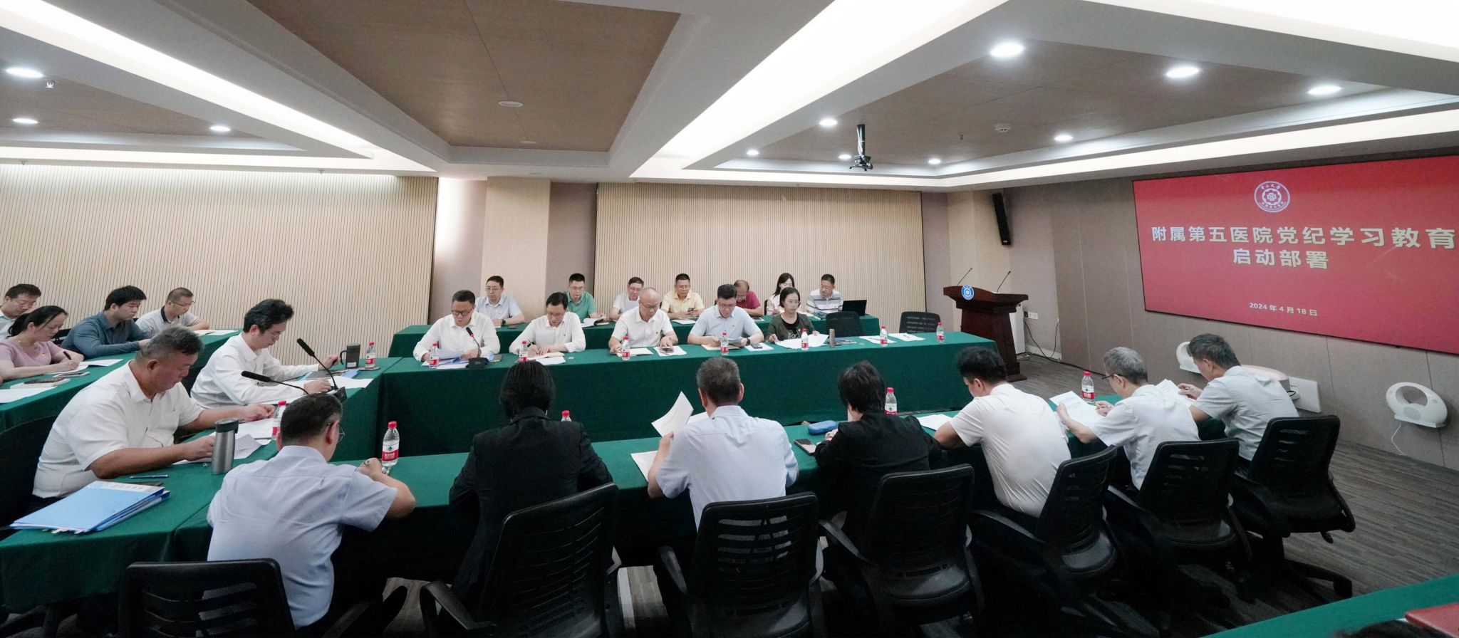 中大新聞網訊(通訊員張家斌)4月18日,附屬第五醫院召開黨紀學習教育啟動部署會,深入學習貫徹習近平總書記關于黨紀學習教育的重要講話和重要指示精神,傳達學習中央、省委、市委和學校相關會議精神,全面部署開展黨紀學習教育。校長助理、院長林天歆,院黨委書記苗偉等院領導、黨委委員、紀委委員、黨支部書記、職能科室負責人等參加了會議。會議由苗偉書記主持。