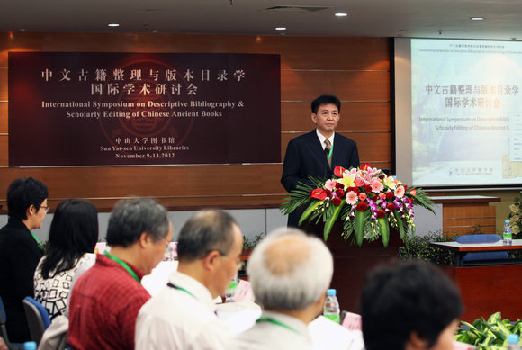 From October the 10th to the 11th, the International Symposium on Descriptive Bibliography & Scholarly Editing of Chinese Ancient Books hosted by Sun Yat-sen University Libraries was held on South Campus, SYSU. The attendants, whose number reached nearly 100, are specialists on Descriptive Bibliography & Scholarly Editing of Chinese Ancient Books from domestic organizations in mainland China, Hong Kong, Macao, Taiwan and foreign organizations in the U.S. and Canada. Shen Xieyuan, a famous Chinese scholar in the field of Descriptive Bibliography approaching his nineties and Wang Guichen aged 84 are also among the attendants. The symposium was addressed by Professor Cheng Huanwen, Director of Sun Yat-sen University Libraries, Ms. Chen Hongyan, deputy director of Ancient Books Library of National Library of China (NLC) and Dr. S?ren Edgren, head of the Chinese Rare Books Project at Princeton University.