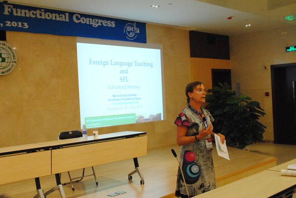 Professor M. Cecilia Colombi from the University of California at Davis taught the 3rd day workshop of Pre-Congress Institute of ISFC40, which centered on the relationship between Foreign Language Teaching and Systemic Functional Linguistics. Professor Colombi focused on the following aspects in her workshop: SFL and educational linguistics, Oral-Written language continuum, academic language, grammatical metaphor, and second language teaching.