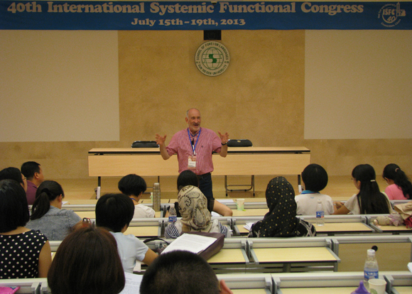 The 4th day workshop of the ISFC40 Pre-Congress Institute was taught by Professor Jonathan Webster from the City University of Hong Kong and Professor Geoff Thompson from University of Liverpool, UK. Professor Webster demonstrated how Systemic Functional Linguistics and other discourse related theories (e.g. Rhetorical Structure Theory) step into and unveil the meaning of a text. He introduced 7 steps to conduct systemic functional discourse analysis, and showed how the patterning of relations between functionally significant text spans at both clause level and above plays a significant role in contributing to the reader’s response to the text.