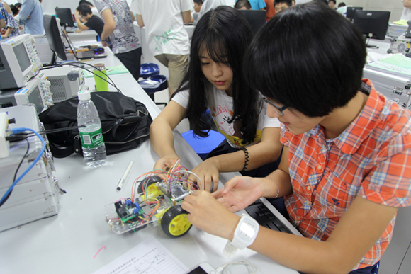 The primary practicum’s teacher team was composed of three parts. They are Associate Professor Kai Huang at SMIE, Senior Engineer Yanxiang Bao from the Teaching Experiment Center on East Campus, and the lecturer team from the Technical University of Munich (TUM) in Germany. First, students learned the operational principle of FGPA board and how to apply C language communication hardware to operate car boards during the several days of theory courses. Then, by means of welding and assembling, they improved and completed the PC board according to their creatively designed schematic diagrams. After a few days of training, the cars they made attained the functions to race straightly, to patrol the black line and to run out of the maze.