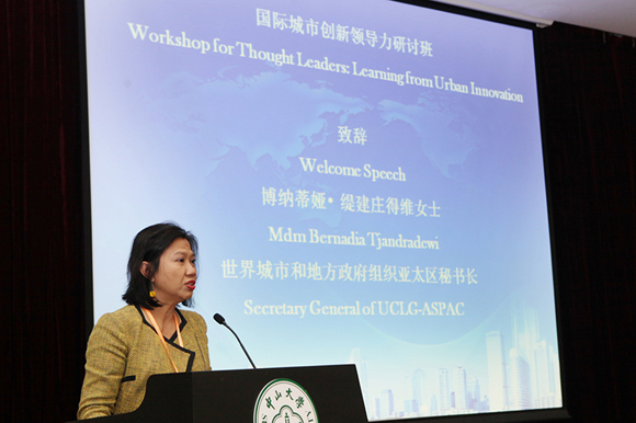 On November 2, 2015, the opening ceremony of the first Workshop for Thought Leaders: Learning from Urban Innovation took place in Sun Yat-sen University, Guangzhou. This workshop is committed to addressing global issues through urban innovation and establishing a global community of sharing experiences on urban governance for cities around the world. Officials of international organizations and local governments from 22 cities of 12 countries participated in this workshop. The workshop is co-hosted by Guangzhou Institute for Urban innovation, Sun Yat-sen University, Urban innovation Committee, UCLG ASPAC and the METROPOLIS, and is organized by Center of Urban and Local Governance, School of Government of Sun Yat-sen University.