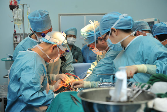 Huang Jiefu, Vice Minister of the Ministry of Health, performing a surgery with Chen Guihua, Director of the the Third Affiliated Hospital