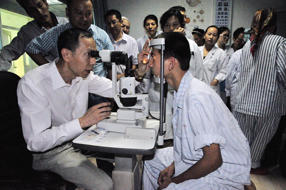 During their visit in Kashi, Secretary Yu Minbin, Professor Wang Zhichong and Professor L? Lin provided demonstrations on glaucoma surgery, lacrimal surgery and vitrectomy respectively, which were observed by the backbone doctors of ophthalmology in the Hospital.