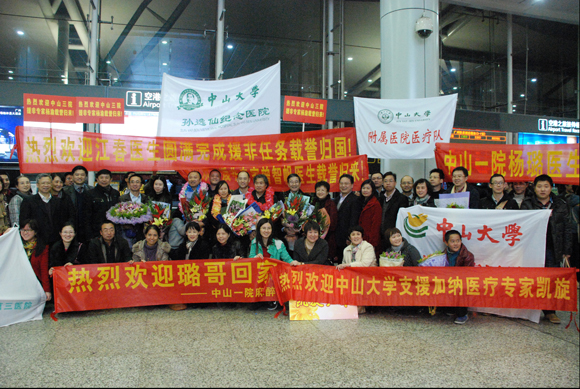 Four doctors from SYSU affiliated hospitals, Yang Lu from The First Affiliated Hospital, Jiang Chun from Sun Yat-sen Memorial Hospital, Yang Yu from The Third Affiliated Hospital and Zeng Zhifan from Sun Yat-sen University Cancer Center, were selected as members of the 2nd Chinese Medical Team and they went to Ghana in December 2011. During the two years, they used their expertise and skills to treat the patients, winning extensive recognition and praise for their excellent work and contributions to the medical development in Ghana.