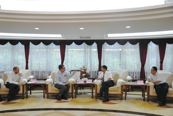 Prof. Wei Minghai (second from right) meets with Prof. Lawrence Young (second from left) in the VIP Room in Zhongshan Building.