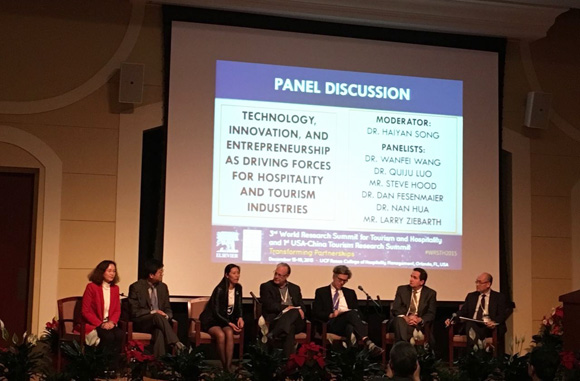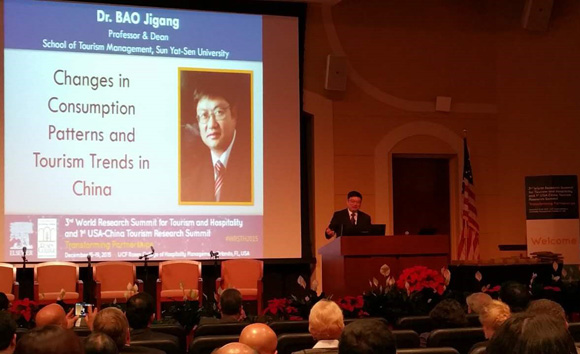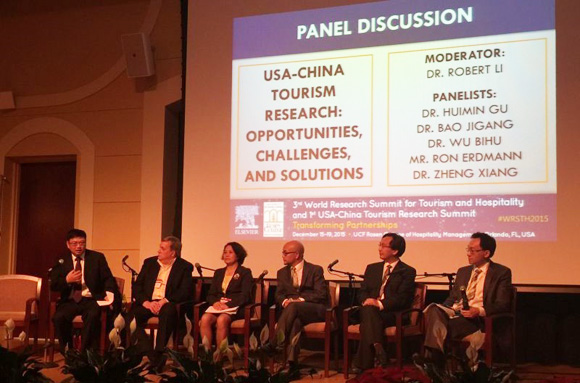 The 3rd World Research Summit for Tourism and Hospitality & 1st USA-China Tourism Research Summit was held on December 15-19, 2015 in Orlando, Florida, USA. Prof. Jigang Bao, Prof. Qiuju Luo, Dr. Zengxian Liang and Ph.D. student Dan Zhu attended the summit on behalf of the School of Tourism Management (STM) of Sun Yat-sen University. This summit was hosted by Rosen College of Hospitality Management in University of Florida, and attracted 252 representatives from 52 countries or regions.