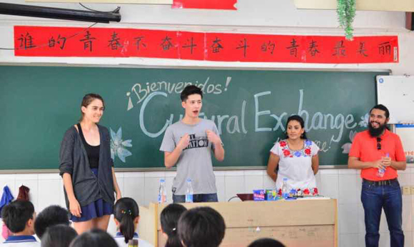 The activity kicked off with a warmup game of charades organized by Ivan McNally and Naomi Lounsbury, both American students in the School of Chinese as a Second Language. The kids enacted a variety of actions and roles, from flying like Superman to swinging an imaginary baseball bat. Next, international staff member Ian Heuer took to the stage to engage the class with some simple German conversation and songs. The class has been studying the language as an elective. The activity then shifted to presentations from Miguel Contreras and Nubia Cano, two students from Mexico. Miguel talked about Mexico and introduced examples of Mexican cuisine. Nubia followed with a simple Spanish language lesson. Both Miguel and Nubia, Confucius Institutes Scholarship holders, are currently studying their Master’s Degree in Teaching Chinese as a Foreign Language; their friendliness and authoritative demeanor helped them create an immediate rapport with the students.