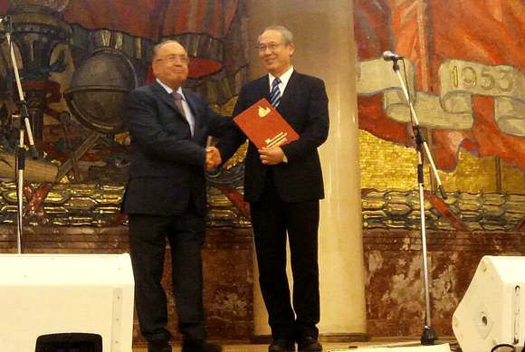 Rector Sadovnichy presenting a letter of gratitude to President Luo Jun