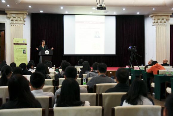 Ambassador Barbara Woodward delivers a speech to SYSU faculty members and students in Swasey Hall.