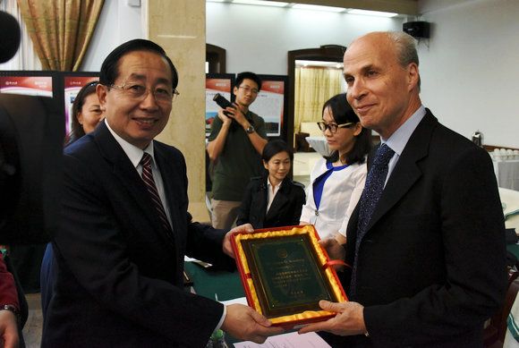 Secretary Zheng Detao presenting certificate of appointment to Prof. Roger David Kornberg, member of the First SYSU Advisory Board
