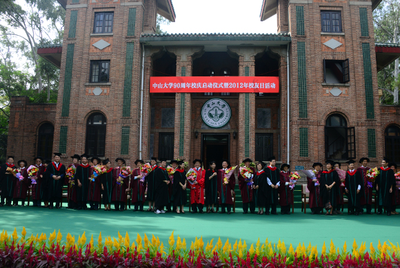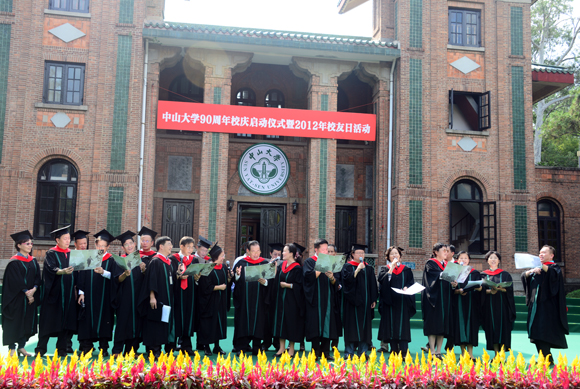On November 10th, a sunny and warm day, Honglok Campus was imbued with laughter everywhere. On the Great Central Lawn in front of the Swasey Hall, more than 1,600 alumni who were admitted into SYSU in 1977, 1978, 1982 and 1988, were wearing the special-made academic robes and having a special "degree ceremony". It is not only the scene of 2012 Alumni Reunion Day, but also the official launching of the 90th anniversary celebrations of Sun Yat-sen University.