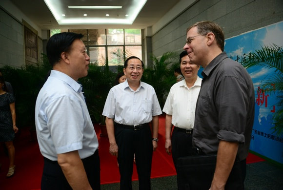 Executive Vice Governor Xiao Zhiheng, Secretary Zheng Detao, Director-General Ou Zhenzhi talking with
