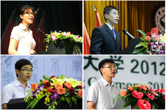 New student representatives Cao Xuemei, He Wei, Lin Hongzhang and Pan Wenmin making a speech respectively