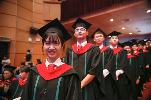 Graduation is not a farewell but a joyful gathering. The graduates show big smiles on their faces.