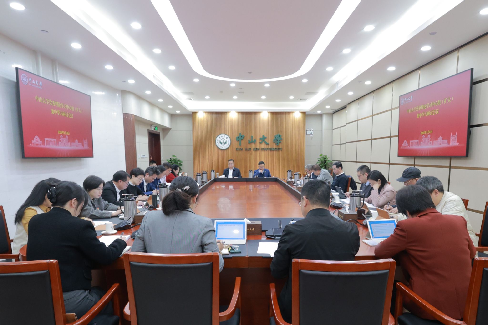 中大新聞網訊(記者張妍)1月8日,我校黨委理論學習中心組(擴大)在廣州校區南校園中山樓開展民主生活會前集中學習。中心組及擴大成員結合民主生活會前學習要求,扎實開展自學,重點學習習近平總書記致中山大學建校100周年重要賀信精神,結合分管工作談學習體會。會議由校黨委書記朱孔軍主持。