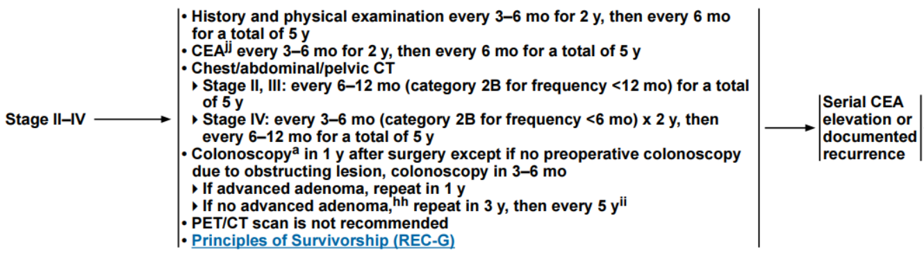 According to the NCCN Clinical Practice Guidelines for Rectal Cancer, serum CEA is a crucial test in surveillance for rectal cancer after treatment, and serial CEA elevation is regarded as a strong marker for potential recurrence that requires more examination or intensive surveillance to confirm it (Figure 1).