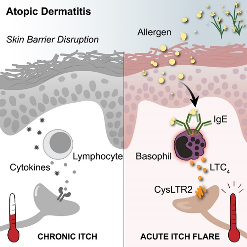 The work published by Dr. WANG Fang et al. identified that patients with AD who harbor allergen-specific IgE exhibit a propensity for acute itch flares from analyses of high resolution clinical trial data. Using animal models, Dr. Wang further demonstrated that acute itch exacerbations induced by allergens were mediated by an innate immune cell population that is called basophils and their related leukotriene C4, a typical inflammatory factor. Although rare in circulation, basophils exhibited direct interactions with sensory neurons in the skin and the specific activation of basophils is sufficient to provoke scratching behaviors in research animals. These findings reveal a previously unrecognized role of basophils in promoting itch and clearly outline new therapeutic targets to advance novel treatments for itch in patients.