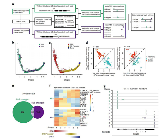The authors applied scRCAT-seq to hESC-derived retinal organoid (Figure 4). In total, 3,407 and 6,395 single cells were collected for 5’-TSS and 3’-TES analysis respectively, randomly distributed into 6 subtypes. Based on the expression pattern of marker genes, the 6 subtypes were matched to RPC, photoreceptor precursor (PR Precursor), Interneuron precursor (IN precursor), photoreceptor cone, retinal ganglion cells (RGC), and horizontal cell (HC). The differences in TSS/TES choices between different subtypes, and dynamics of isoform switching during cone development from RPC were further assessed. They found that the proximal isoform of CCND1a (truncated CCND1a) is expressed in RPC, and the distal isoform (CCND1a) is expressed in PR precursors and cone. The isoform switch from truncated CCND1a to CCND1a may suggest that CCND1 mediates differential cell-cycle properties between RPC and PR precursors.