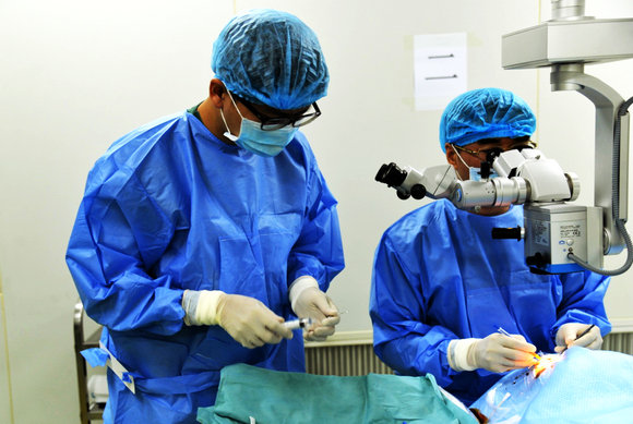 The medical team from Zhongshan Ophthalmic Center is performing a cataract surgery in Yushu.